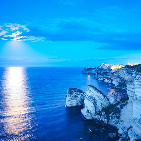 Come with me at 4:30 a.m. atop the Cliffs of Bonifacio, Corsica, the white limestone escarpment illuminated as though it were midday, to witness a stunning Blue Sturgeon Supermoon (yes, that’s what astronomers dubbed it) setting above the Mediterranean.